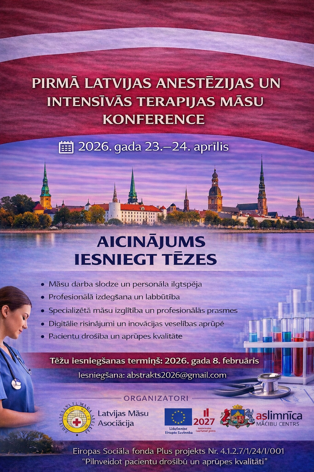 Aicinām māsas, pētniekus, pedagogus un veselības aprūpes sadarbības partnerus iesniegt savus abstraktus un piedalīties zinātniskajās diskusijās, kas veidos nākotnes virzienus anestēzijas un intensīvas terapijas māsu praksē Latvijā.